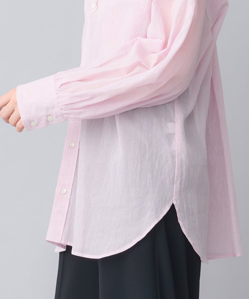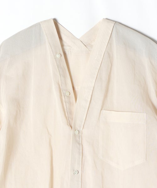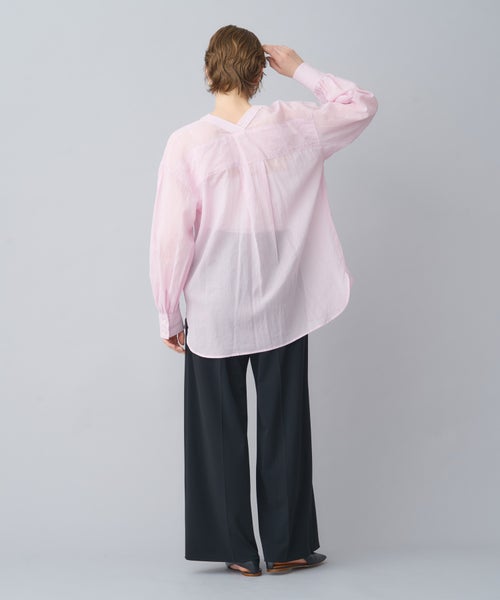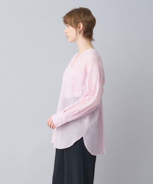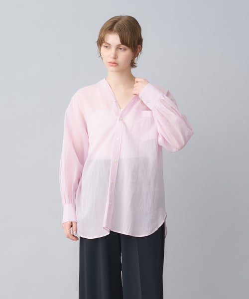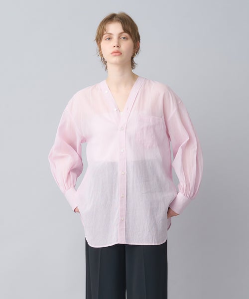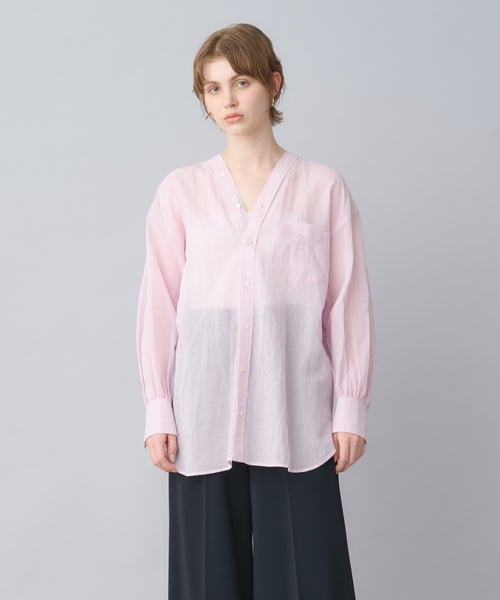 【デザイン】 顔まわりをすっきりと見せるノーカラーのVネックブラウス。やわらかく描いたネックラインのカーブと、さりげないボタンディテールが女性らしい印象を引き立てます。シアーなストライプ柄とリラクシーなシルエットが、ほどよい抜け感を演出。春らしいやさしいカラー展開も魅力。コーディネートに取り入れるだけで季節感をぐっと高めてくれる一枚です。1枚で軽やかに着るのはもちろん、インナーにタートルネックを合わせればロングシーズン活躍します。