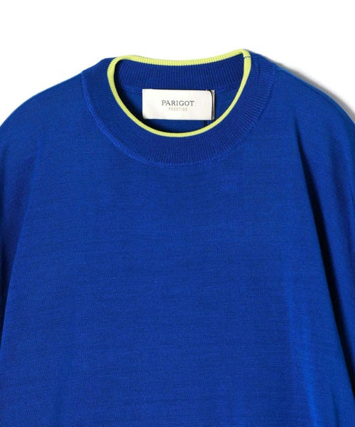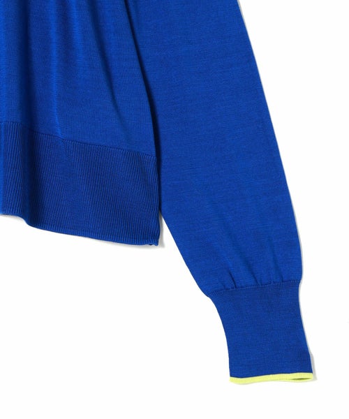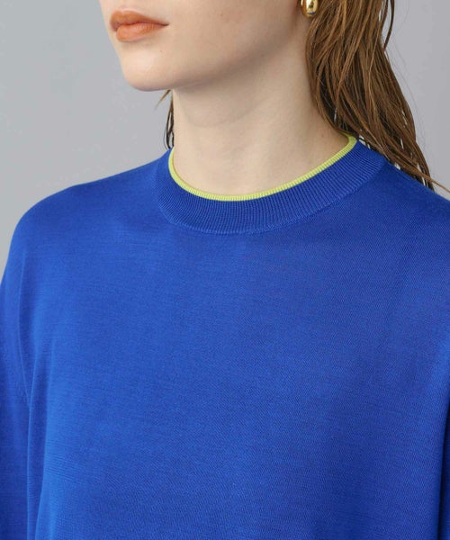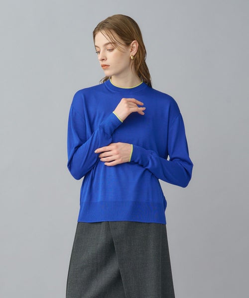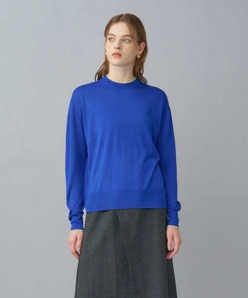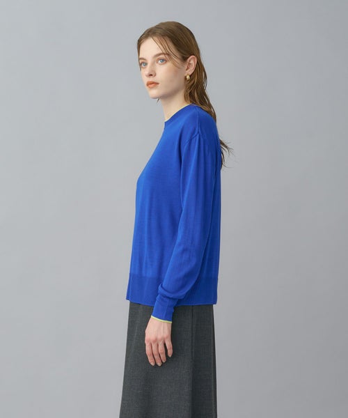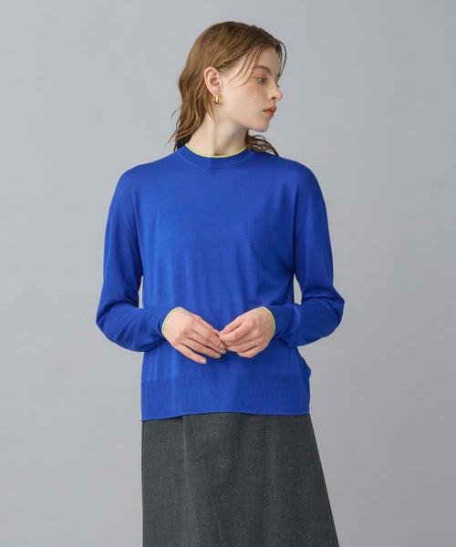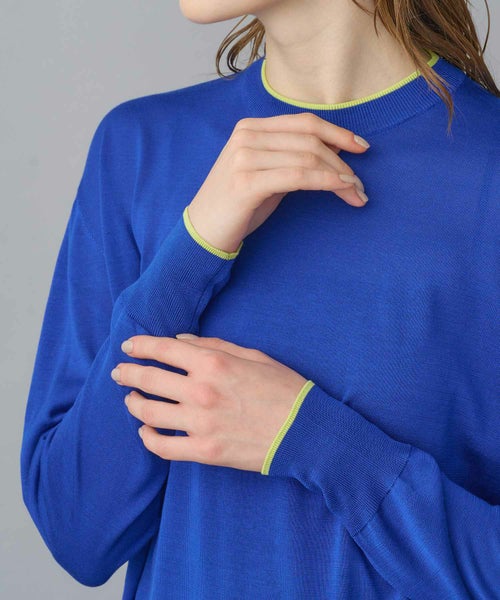 天然シルク100%を使用し、滑らかで上品な光沢を持つニット。襟ぐりと袖口の配色がさりげないアクセントとなり、シンプルな中にも上品さを演出します。