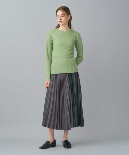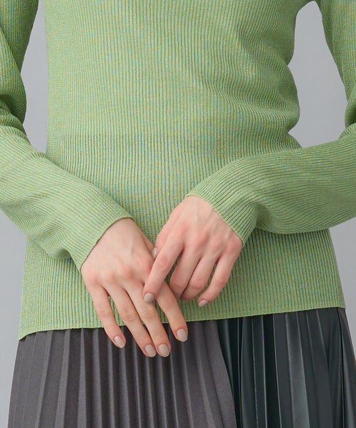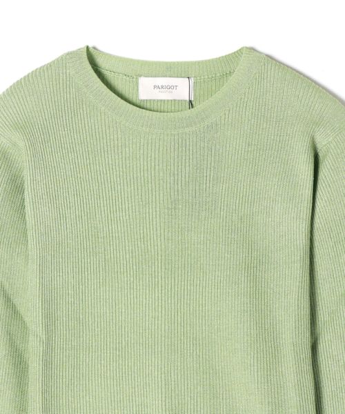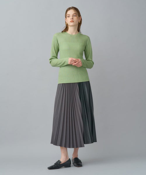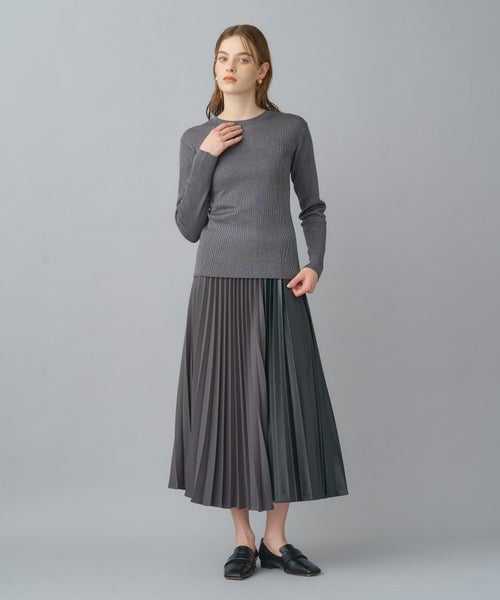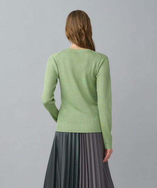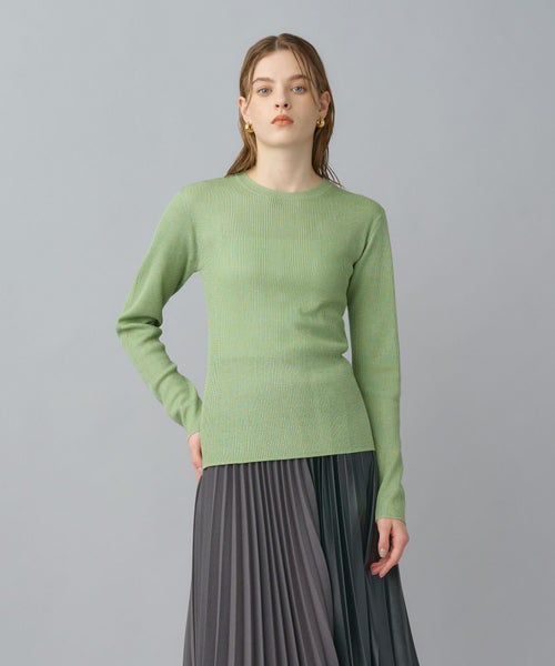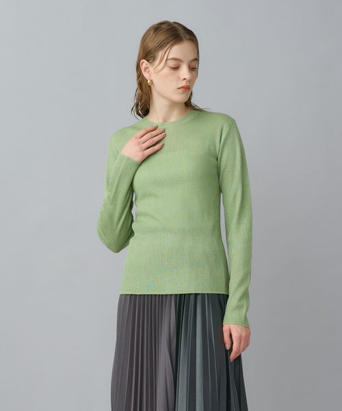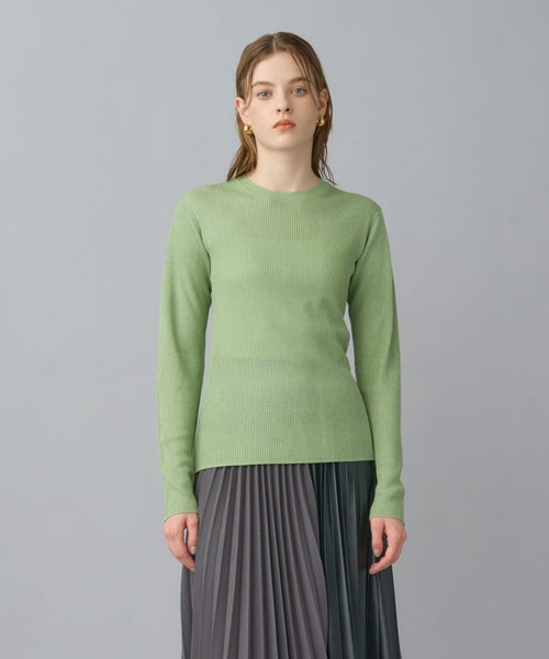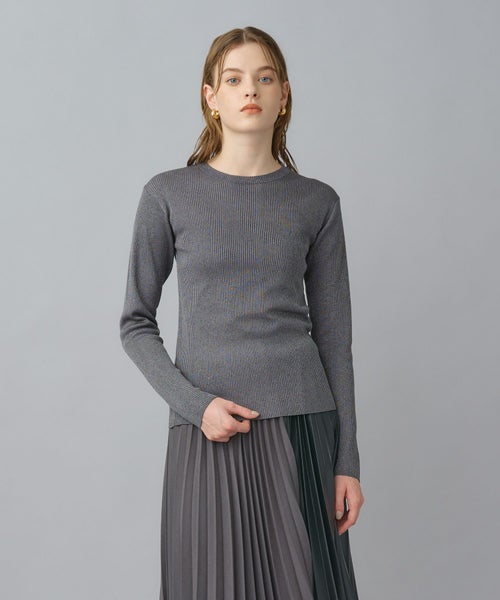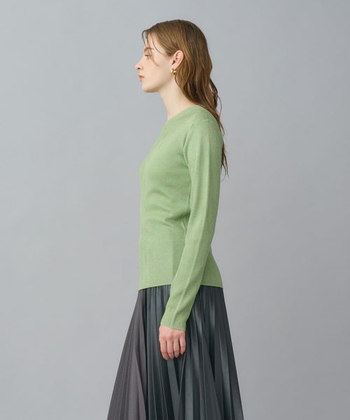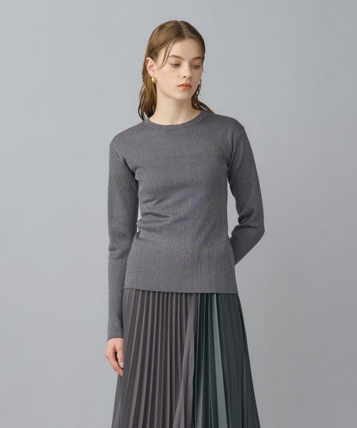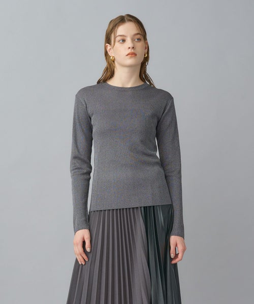 非常に繊細な細番手のシルク糸にラメ糸をブレンドしたクルーネックニット。しなやかで上質なシルクの光沢に、ラメが華やかさを添え、デイリーから特別なシーンまで幅広く活躍します。細リブ編みがすっきりとしたシルエットを作り、身体のラインを美しく見せてくれます。