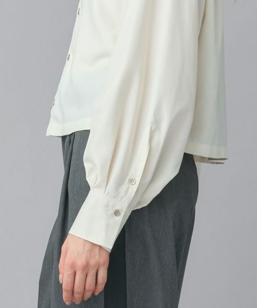【デザイン】 袖下にあしらったボタンで、シルエットの変化が楽しめる2WAYデザインのクロップドシャツ。ボタンを留めればすっきりとした印象に、開ければ自然なドレープが生まれ、動きのあるスタイルが完成します。マットな薄シルバーのボタンが、モードなエッセンスをプラスしています。また、クロップド丈が軽やかで、ボトムスを選ばず着回し力も抜群です。