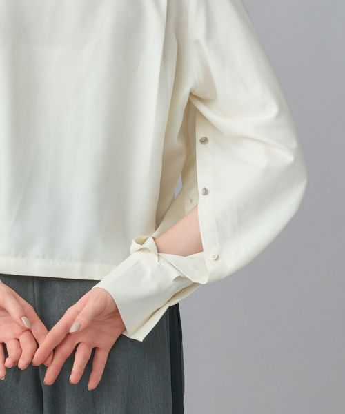 袖下にあしらったボタンで、シルエットのアレンジが可能。ボタンを留めればすっきりとした印象に、開ければ自然なドレープが生まれ、動きのあるスタイルに仕上がります。クロップド丈が軽やかさを演出し、ボトムスを選ばず幅広いコーディネートに対応します。