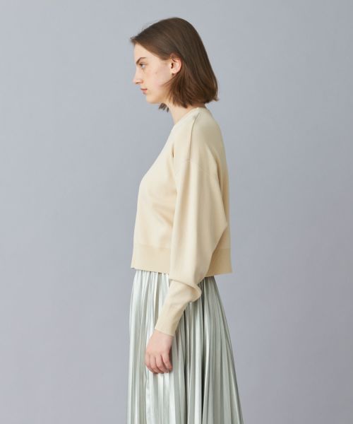 「スリーブボタンクルーネック」と同じ糸を使用しており、そのベーシックな特徴を引き継ぎつつ、トレンド性をプラスしています。「お客様にこういったアイテムを届けたい」というスタッフの要望から生まれたこのデザインは、より現代的なスタイルを演出します。