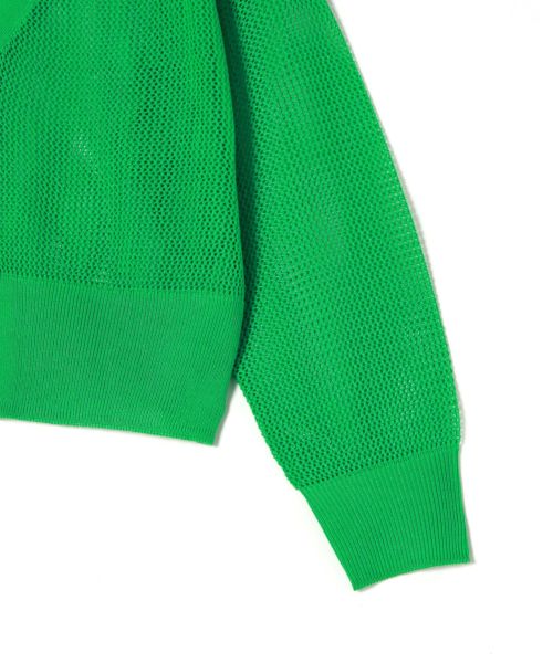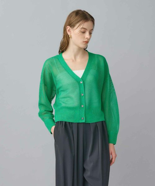 【デザイン】 クロップド丈でコンパクトに仕上げた、メッシュ編みのニットカーディガン。 程よい透け感が抜け感とセンシュアルな雰囲気を演出し、羽織るだけで旬なバランスに仕上がります。 フロントのボタンを留めてプルオーバー風にも着用できる2WAY仕様で、コーディネートの幅も広がります。清涼感のあるルックスはシーズン長く活躍します。