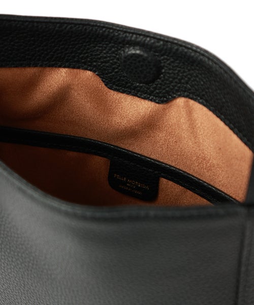 【デザイン】PELLE MORBIDA(ペッレモルビダ)のバッグ。長いハンドル部分をループに通して使用する巾着型のバッグとなっており、シンプルなディティールのためちょっとしたお出かけやオケージョンシーンなど服装を選ばずに幅広く活躍します。長財布やペットボトルも入り、収納部分はポケットが2つあるうち1つはジップ付きのポケットで、コンパクトながらも収納力のある逸品です。ジェンダーレスで使い勝手のよいアイテムに仕上がっています。