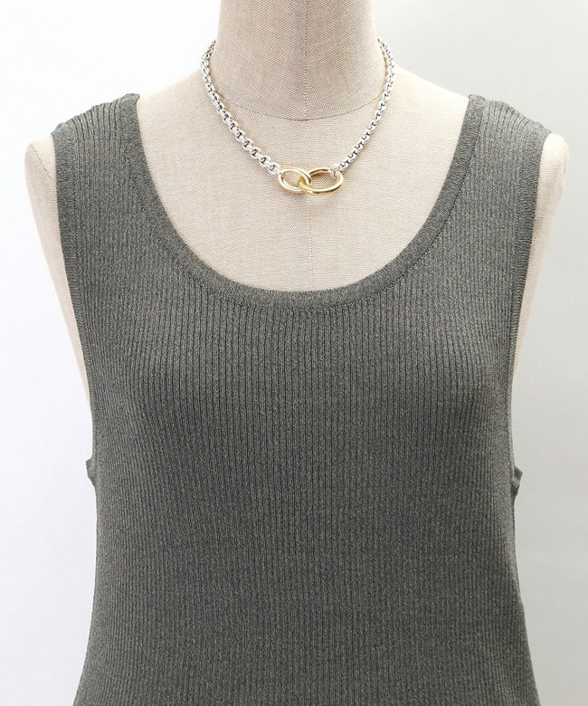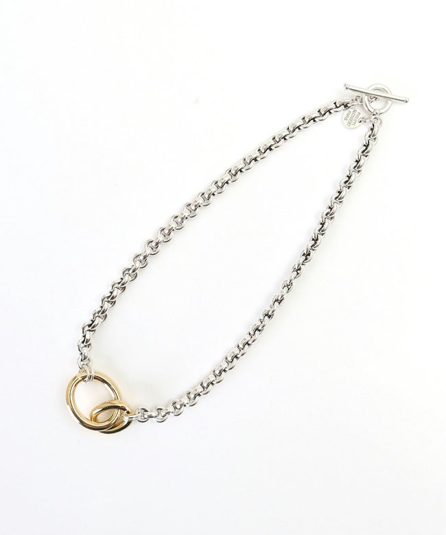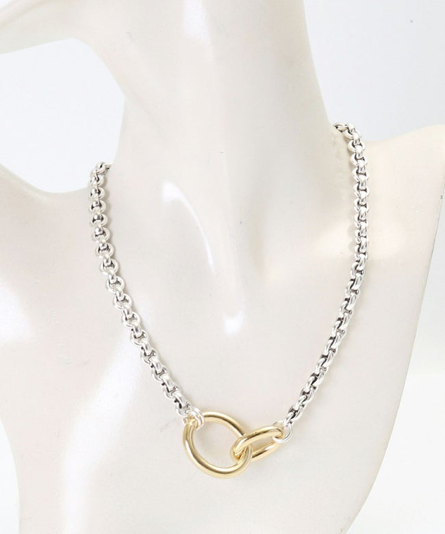 【デザイン】 ボリュームのあるデザインチェーンでクールに仕上げたネックレス。大きさの違う2つのゴールドのフープが目を惹きます。シルバーとゴールドのバイカラーがポイントで程よいボリューム感がコーディネートのアクセント使いにぴったりです。