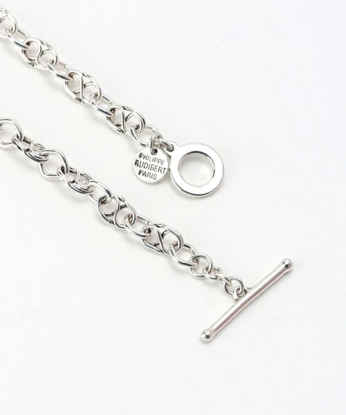 【デザイン】Philippe Audibert(フィリップ オーディベール)のネックレス。トラディショナルかつ洗練された、2つのシルバーチェーンの表情が独創的。シンプルなスタイルのエッジィなアクセントになる特別なネックレスは、地金のみのシンプルなデザインで合わせるものを選ばないのがポイント。マンテル式で付けハズシがしやすいのも◎。