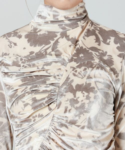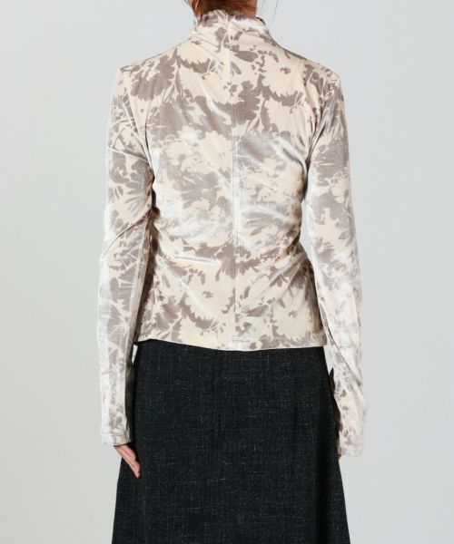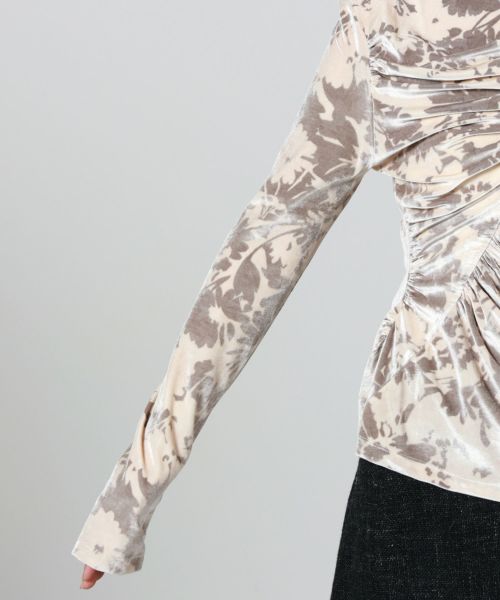 【デザイン】PHOTOCOPIEU(フォトコピュー)のカットソー。ベルベット生地に裏側からガーベラのカモフラージュをプリントした生地 を使用したアシンメトリートップです。ストリートのイメージのあるカモフラ ージュを落とし込んだようなデザイン。 伸縮性があり、体のラインを拾いすぎないサイズ感でリラックスして着用 していただけます。 センターバックコンシールあき。