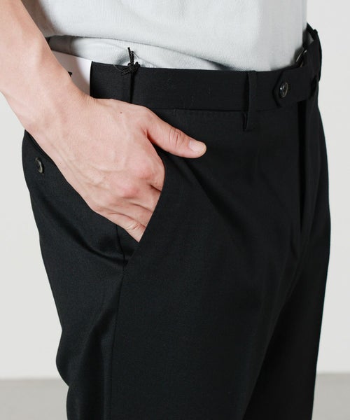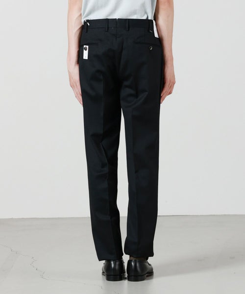 【デザイン】PT TORINO(ピーティートリノ)のパンツ。スリムフィット仕様のスラックスです。ノータック仕様なので腰回りのシルエットもすっきりしたモデルです。ウエスト背面に施されたV字のスリットも快適な履き心地に寄与し、内側にはブランドのネームの入ったパイピングがマーベルトの役割を果たしてくれます。 ヒップポケットはキレイに両玉縁仕上げとなっており、ブランドの技術力の高さが伺えます。ボタンもオリジナルのブランドネームの入ったボタンを使用しており細かなディテールまで拘った一本です。