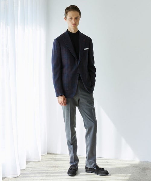 【素材】 自宅でケアが可能なウォッシャブルウールのフランネル素材で中肉の厚さなので秋冬向けの生地です。ややハリ感がありますが、ストレッチ素材が入っており可動域も高くビジネスでもストレスなく着用いただけます。