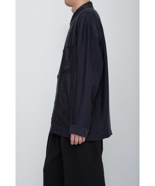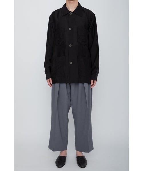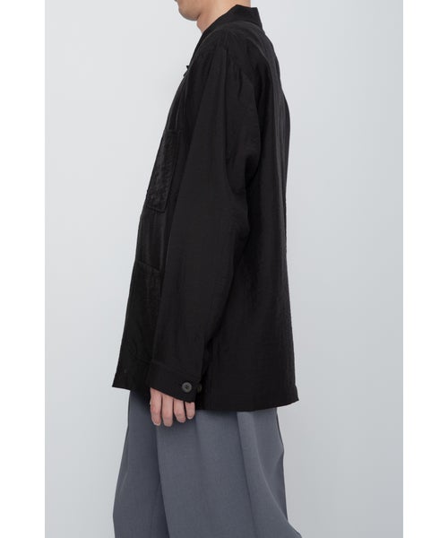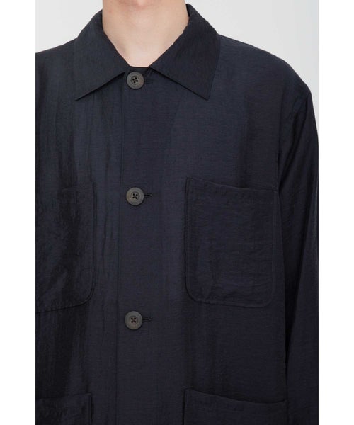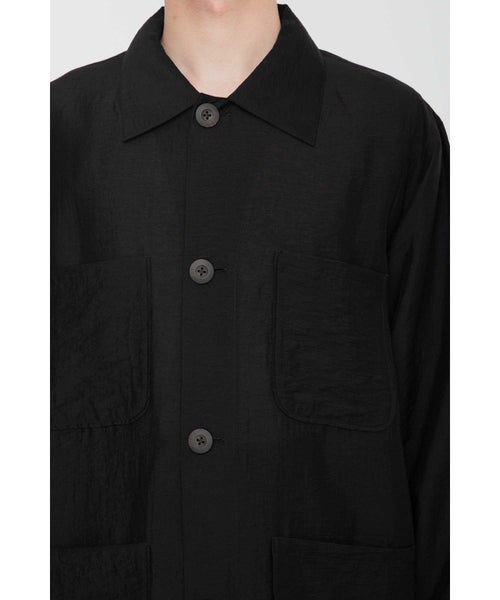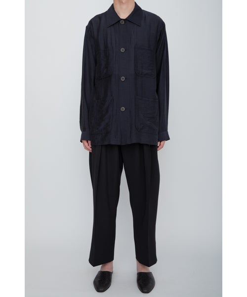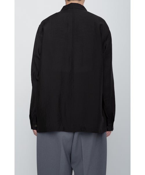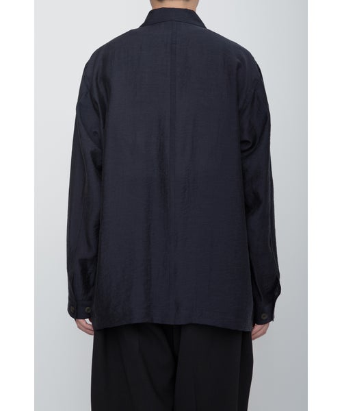 【デザイン】 RAINMAKER(レインメーカー)のワークシャツジャケット。シアーな質感が特徴的なシルク混素材を使用し、軽やかでエアリーな印象を与えます。そのため、ライトアウターとしてもシャツとしても着用できる非常に汎用性の高い一枚です。シンプルでありながら、素材の持つ柔らかな光沢とシアー感が、シックでリラックスした雰囲気を作り出します。自然なシワ感を加えるためにタンブラー加工が施されており、無駄のない洗練されたデザインに仕上げられています。カジュアルなワークシャツのデザインを、シンプルでありながら上品に仕上げており、コーディネートにアクセントを加えます。