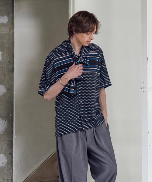 【デザイン】 RAINMAKER(レインメーカー)のシャツ。柔らかな素材感と快適な着用感を提供するオープンカラーシャツです。全体に極力ステッチを見せないように袋縫いを多用し、シンプルでミニマムな表情に仕上げられています。全体に施された七宝文様に着想を得たドット柄プリント地が、シンプルなデザインの中で程よいアクセントとなり、シックでありながらも遊び心のあるスタイルを演出します。胸元に施されたカラフルなラインが、より一層スタイリッシュで鮮やかな印象を与えます。ユニークで個性的な要素を加え、コーディネートに華やかさをプラスする一枚です。