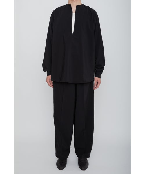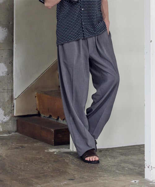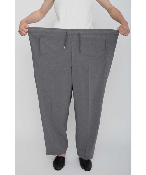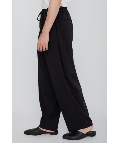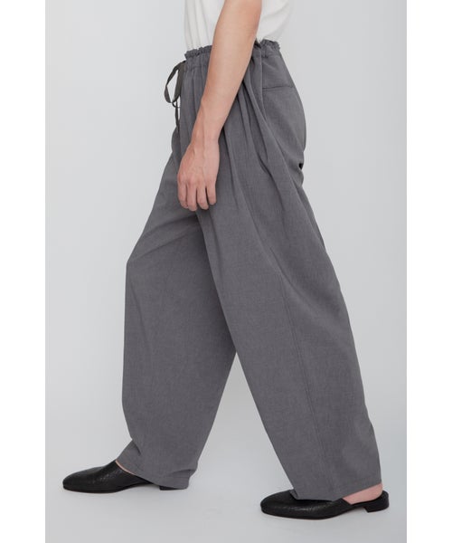 【デザイン】 RAINMAKER(レインメーカー)のパンツ。大胆に大きく設定されたウエストデザインが特徴的なイージーパンツです。ゴムで絞ることによって生まれる腰回りのギャザーが、リラックス感を与えながらも、独自のドレープを作り出し、動きに優雅さを加えます。フリーサイズですが、腰紐でウエストを自由に調整でき、快適な着用感を提供します。バギーフィットとワイドレッグのシルエットが、モダンでありながらもリラックスした印象を与え、コーディネートに洗練されたアクセントを加えます。