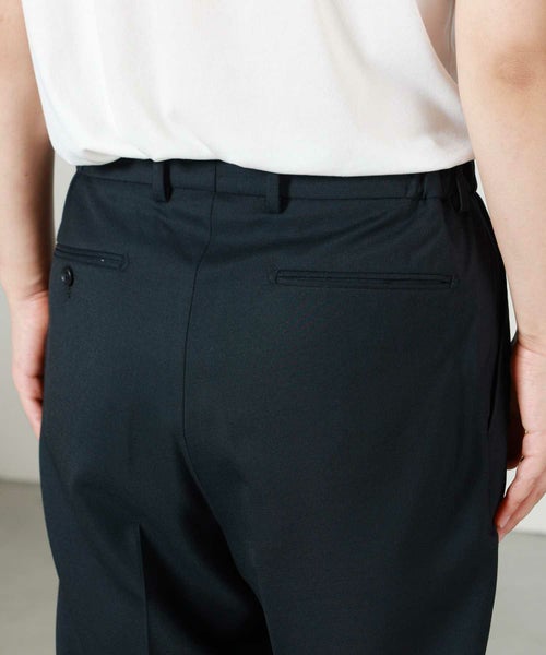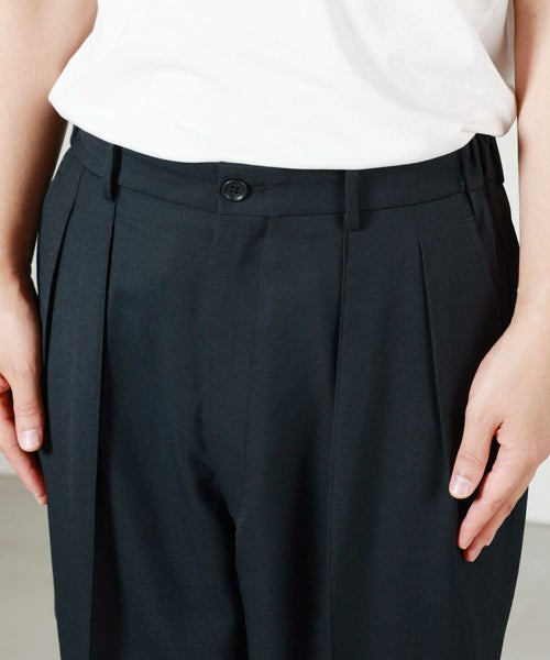 ゆったりとしたヒップ・ワタリから裾口に向けて、 テーパードのかかった美しいシルエットのシャーリングトラウザーです。 美シルエットはそのままに、ドローストリングと脇ゴムにより、快適な穿き心地を担保。 日常的な着用はもちろん、ドレスアップまで様々なシチュエーション に対応します。