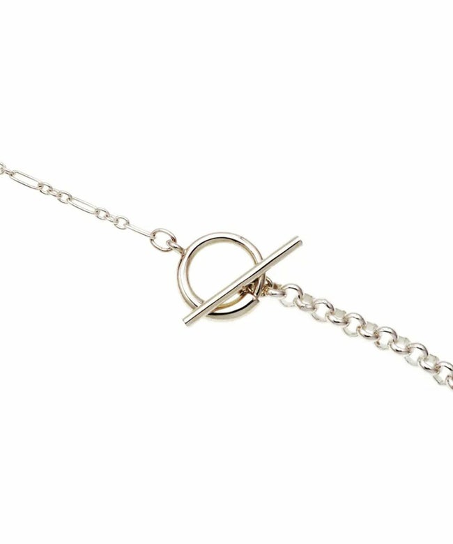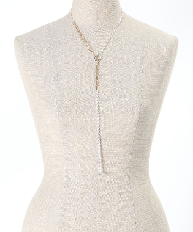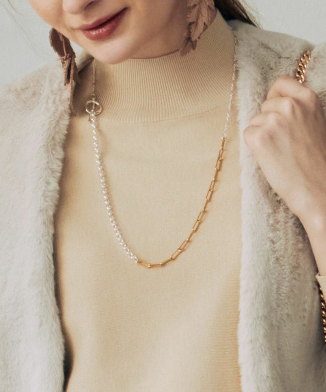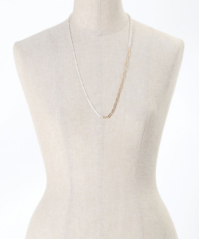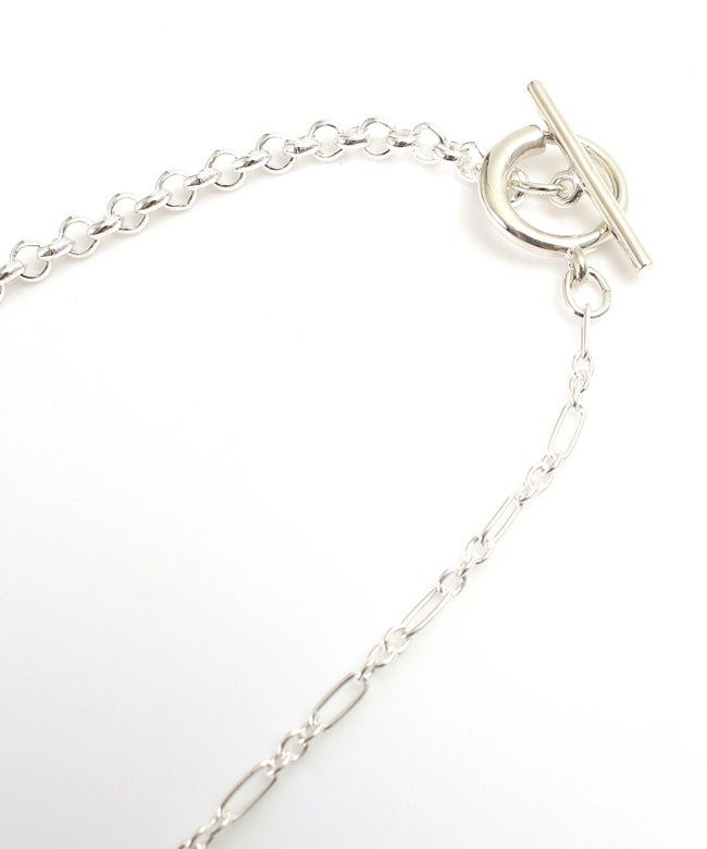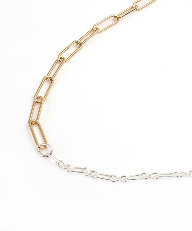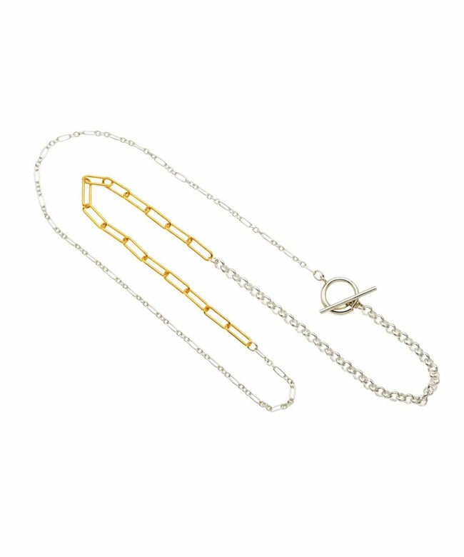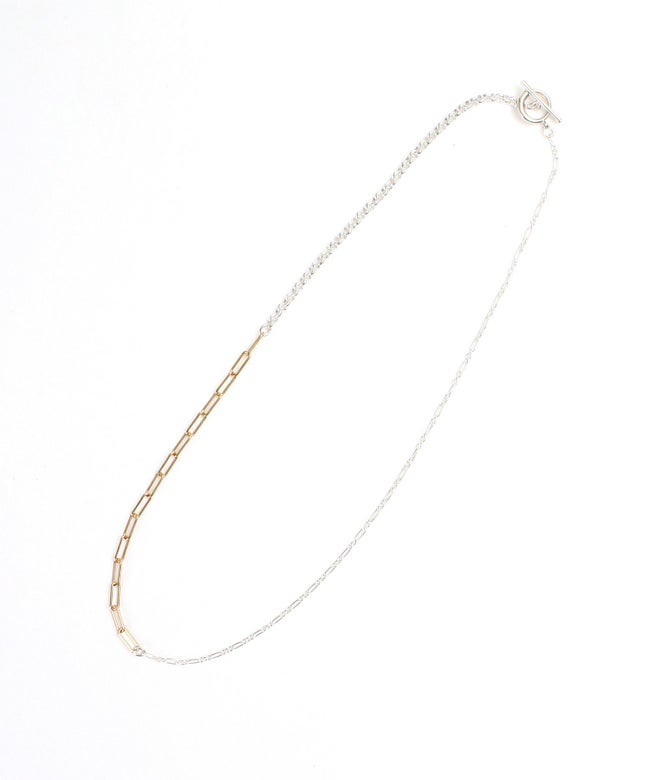 【デザイン】3種類のチェーンを組み合わせたネックレス。華奢なシルバーチェーン2種にイエローゴールドのスクエアチェーンを組み合わせています。ロングネックレス、Y字ネックレス、チョーカーにバックチェーンと、着こなしに合わせてお好きなバランスで着用できるアイテムです。