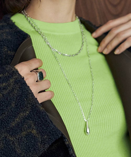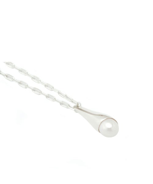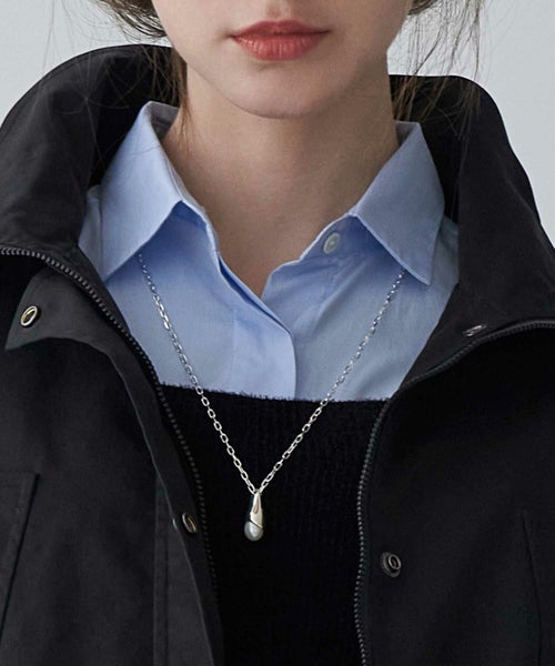 【デザイン】 大きめのパールに水が滴るようすをモチーフにしたネックレス。キラキラと輝くシャープなチェーンがアクセントを添えてくれています。存在感あるデザインで、顔周りを華やかに仕上げてくれます。