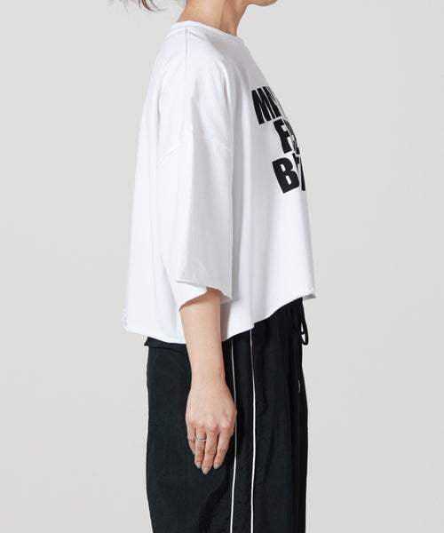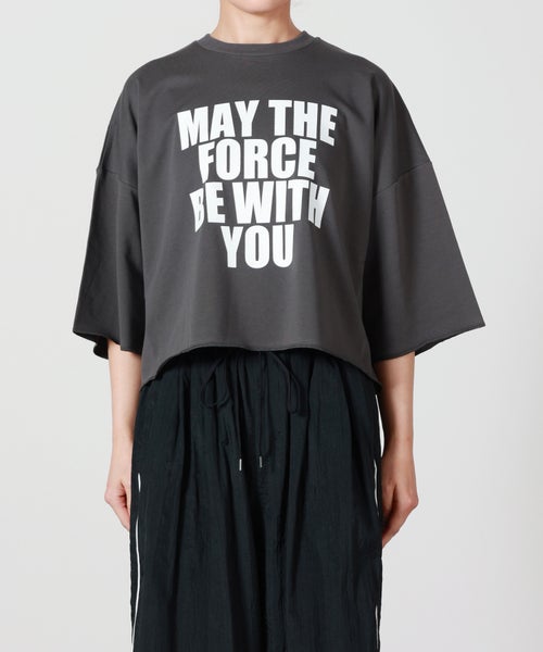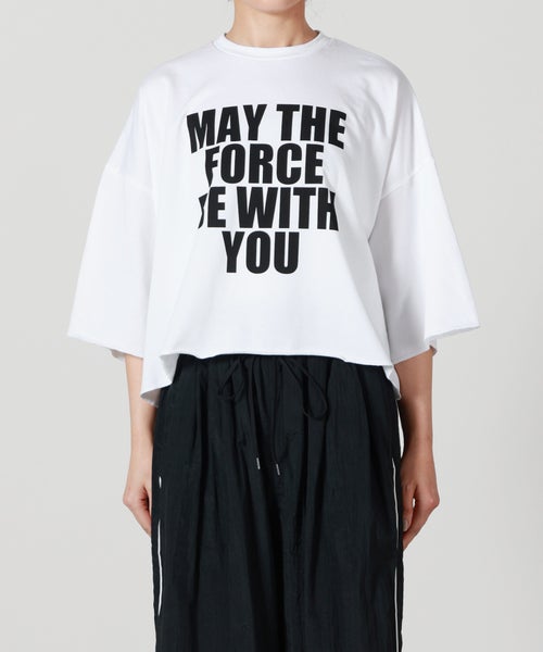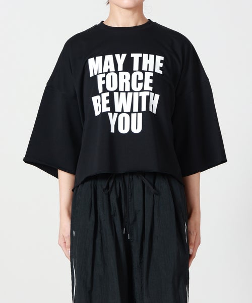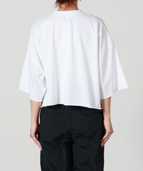 【デザイン】SACRA(サクラ)のトップス。大胆なロゴデザインが目を引く、存在感のあるクロップドトップ。コンパクトな着丈と、肘までしっかり隠れるハーフスリーブのバランスが絶妙で、トレンド感のあるシルエットを演出します。袖口と裾は断ち切りロック仕様にすることで、程よいラフさとこなれた印象をプラス。ハイウエストボトムやワイドパンツと合わせることで、バランスよくスタイルアップが叶います。やや短めの丈感のため、インナーとのレイヤードで肌見せを調整するのもおすすめです。