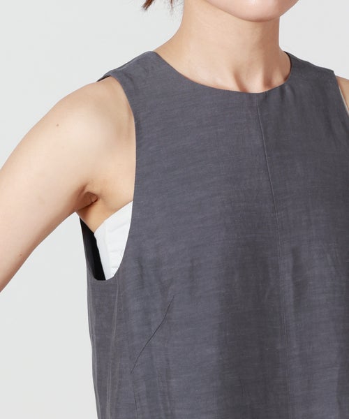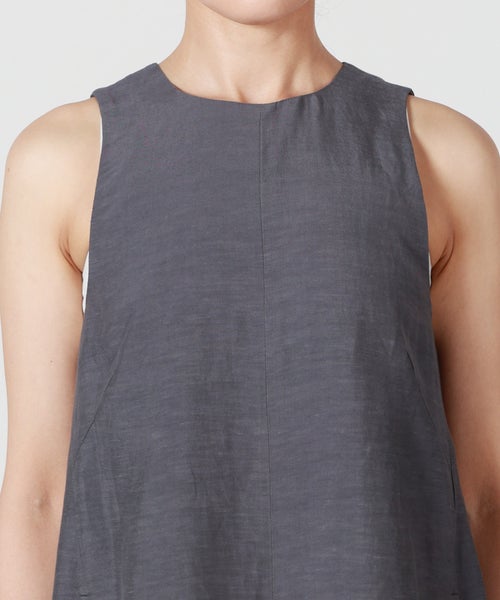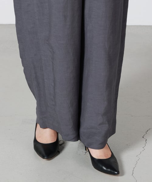 【素材】 レーヨンとリネンをブレンドしたタンブル素材は、柔らかさとナチュラルな風合いを兼ね備えた質感が特徴。触れた瞬間に感じるしなやかさと、リネン特有のドライなタッチが心地よく、暑い季節でも快適に着用いただけます。レーヨンの落ち感が美しいドレープを生み、動くたびに上品な揺れ感を演出。表面には程よいシワ感があり、こなれた雰囲気を引き立てます。