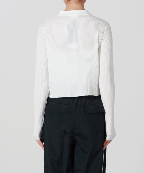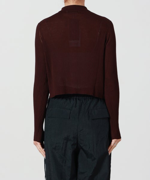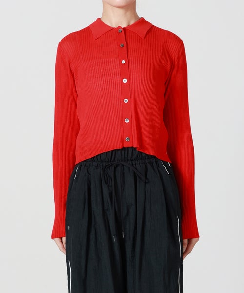 【デザイン】SACRA(サクラ)のカーディガン。トレンド感のあるポロネックデザインと、コンパクトなクロップド丈が印象的なリブカーディガン。身体に程よくフィットするシルエットながら、リブ編み特有の伸縮性で窮屈感なく着用できます。フロントボタンを閉じてプルオーバー風に着こなすことで、より旬なスタイリングに。ハイウエストボトムやワイドパンツ、スカートともバランスが取りやすく、羽織りとしても一枚着としても活躍する汎用性の高い一着です。