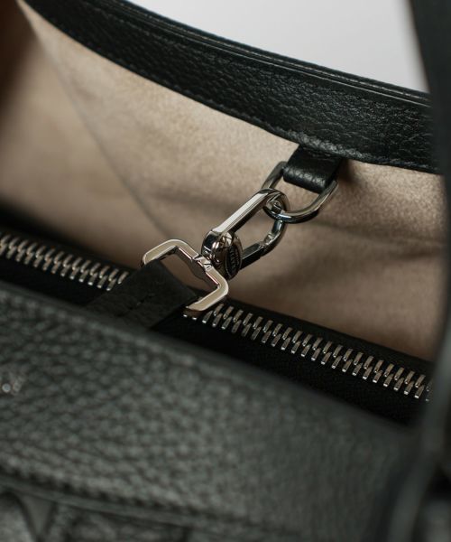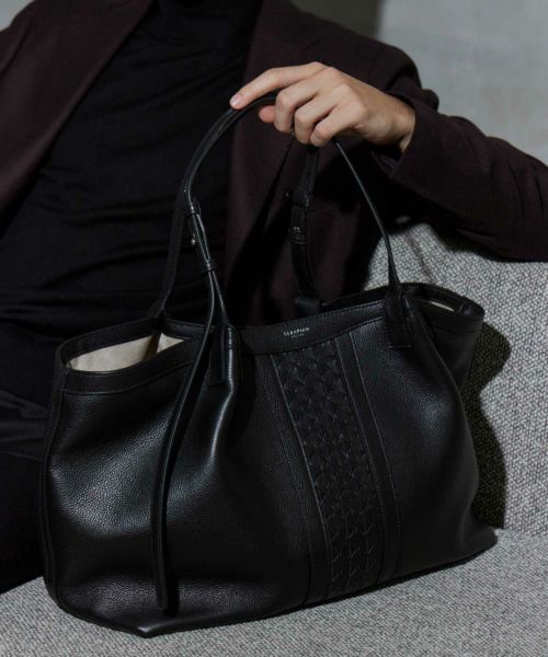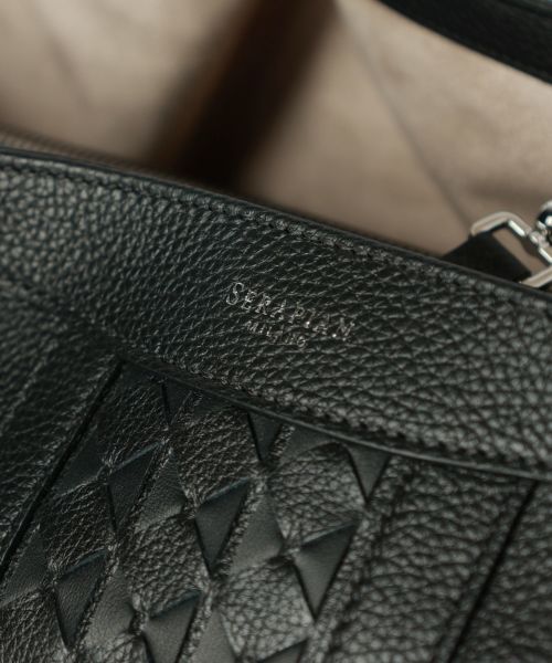 【デザイン】SERAPIAN(セラピアン)のトートバッグ。ブランドの象徴とも言える“MOSAICO(モザイコ)”編みディテールを施したデザインは、控えめながらもラグジュアリーな存在感を放ち、シーンを問わず活躍します。荷物の整理整頓に優れたインナーポケットや2つの大きなコンパートメントに加え、中央にはファスナー仕様のセキュリティポケットを配置。通勤やジム、日常の買い物など幅広いライフスタイルに対応する機能性が魅力です。アジャスタブル仕様のレザーハンドルは、手持ちでも肩掛けでもバランスよく持てる長さに調整可能。タイムレスなデザインで、装いにミラノの洗練をプラスしてくれる逸品です。