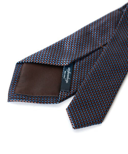 【デザイン】 扱いやすい小紋柄のネクタイです。シルク100%のツヤのある素材を使用しており、スタイリングにさりげないアクセントを添えてくれます