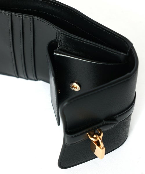 【デザイン】STELLA McCARTNEY(ステラ・マッカートニー)のウォレット。アイコニックな「ライダー」シリーズから着想を得た、カーブを描くフラップデザインが特徴の三つ折りウォレットです。前面にはブランドを象徴する真鍮製のパドロックチャームをあしらい、スタイリッシュなアクセントをプラス。コンパクトながら、紙幣や小銭入れ、レシート用スリップポケット、そして6枚分のカードスロットを備え、日常使いに十分な収納力を発揮します。スナップボタン式で開閉がスムーズに行え、バッグの中でもかさばらず、特に同シリーズのライダーバッグに収めやすい設計です。