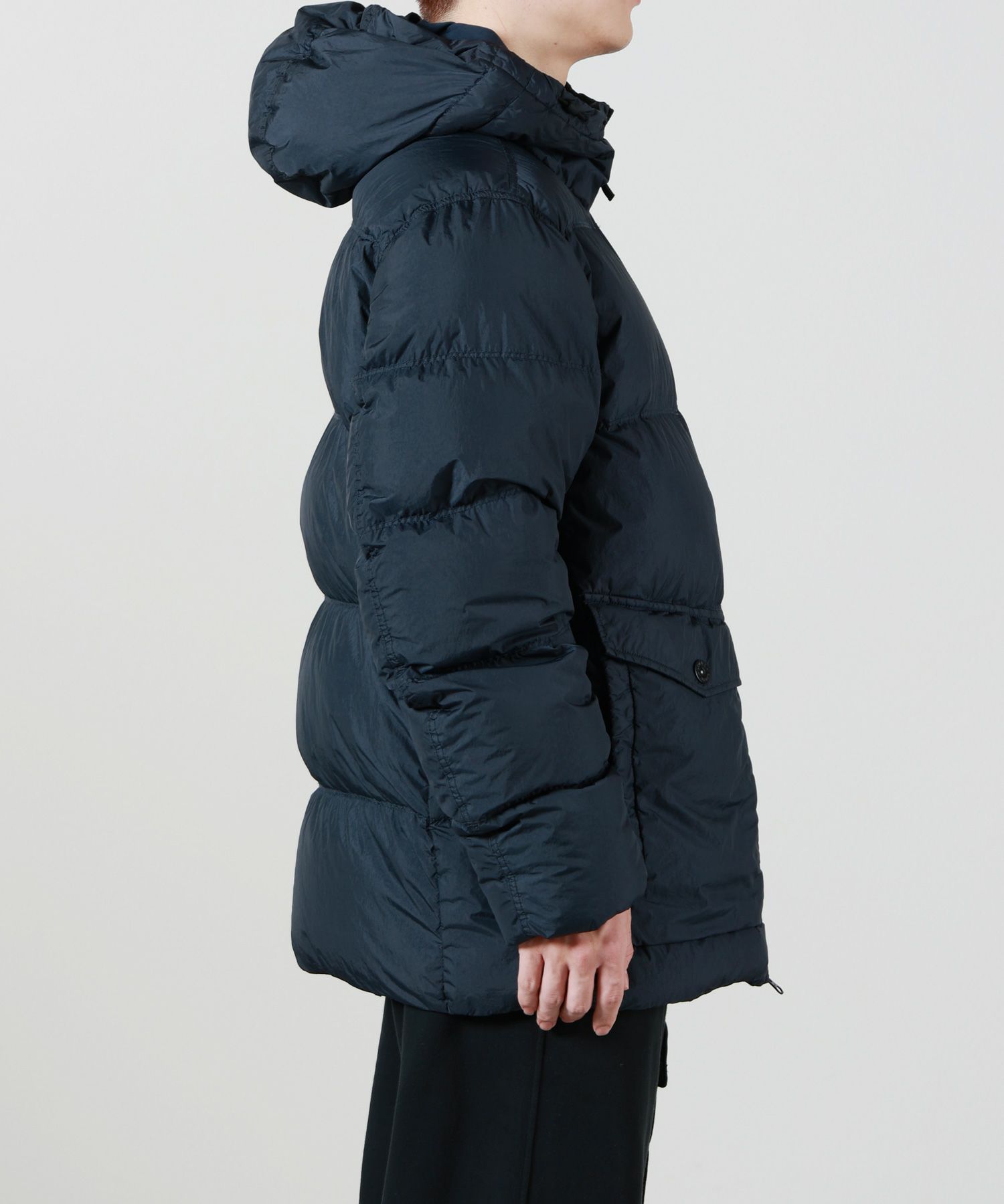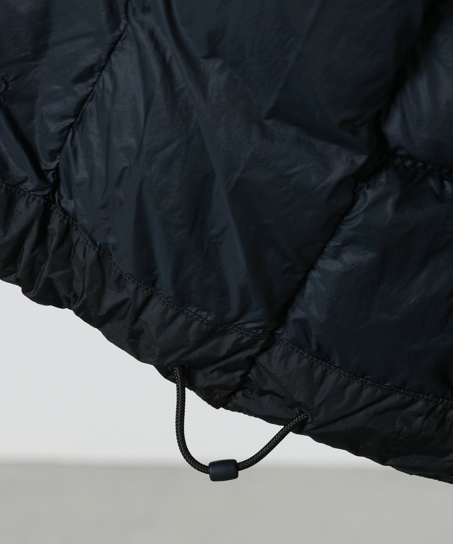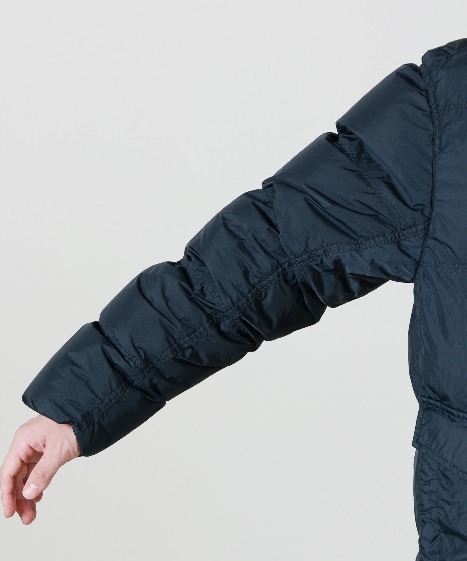 【素材】超高密度で織り上げた軽量なリサイクルナイロンファブリックを使用。内側に樹脂コーティングを施し、防風性と適度な防水性を与えています。樹脂加工を施すことで染料が素材に不均等に浸透し、表面に独特のシワ感が生まれるデザイン。ガーメントダイの工程に耐えられるよう、特殊な加工を施した最高品質の羽毛を充填しています。RDS(Responsible Down Standard)認証取得の羽毛を使用。