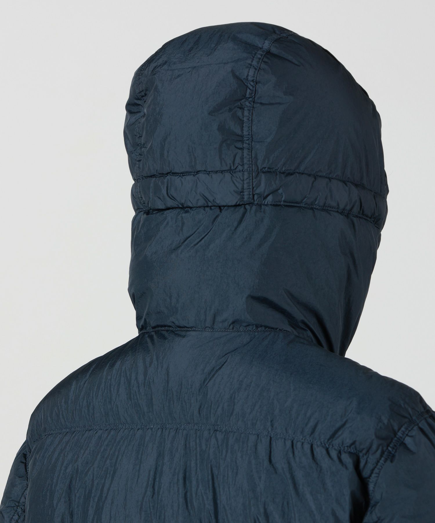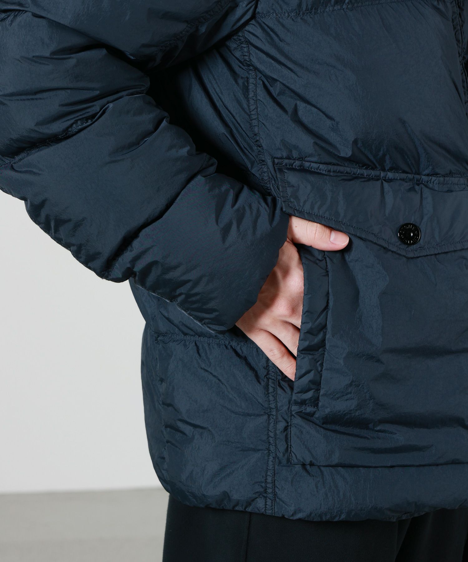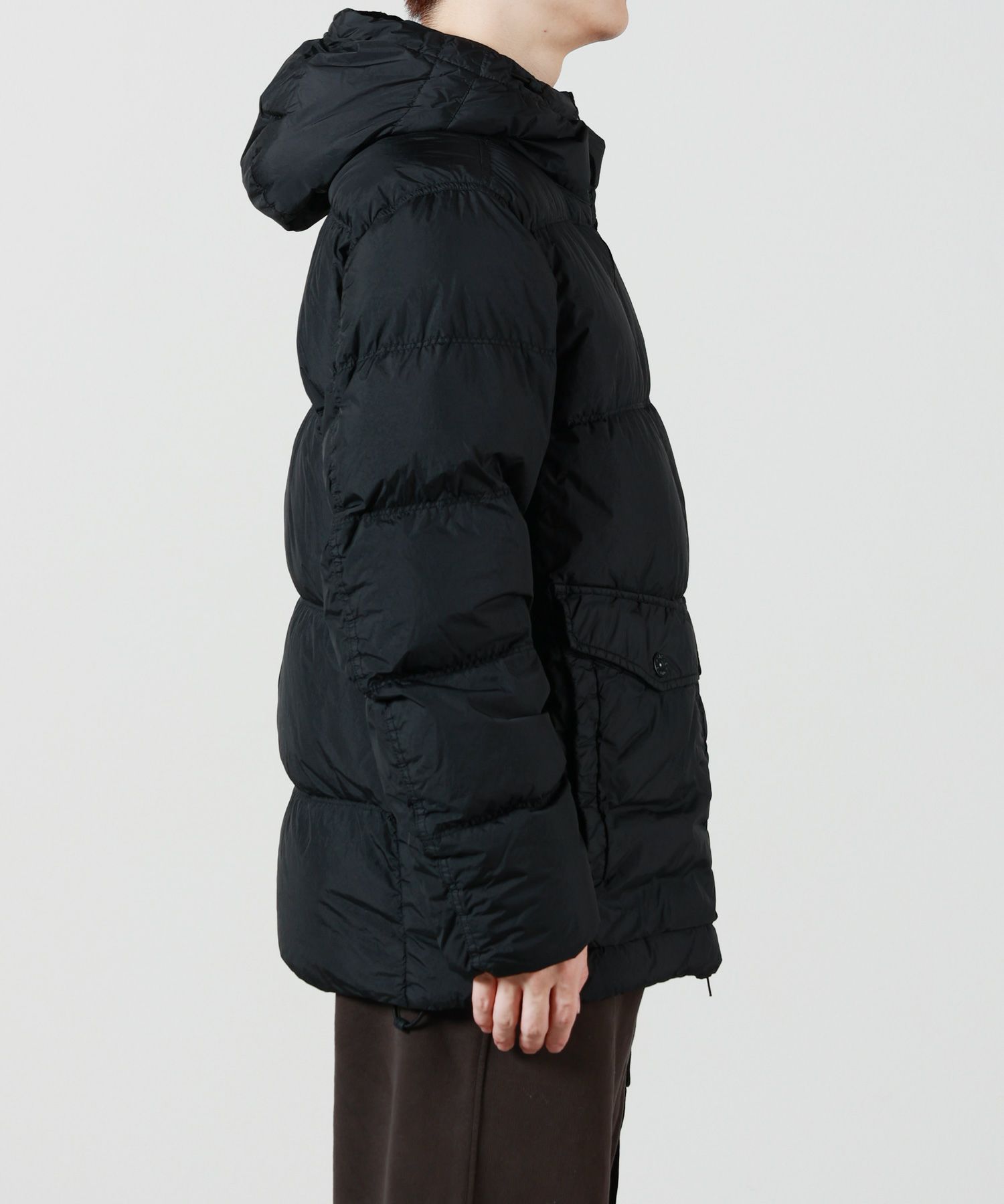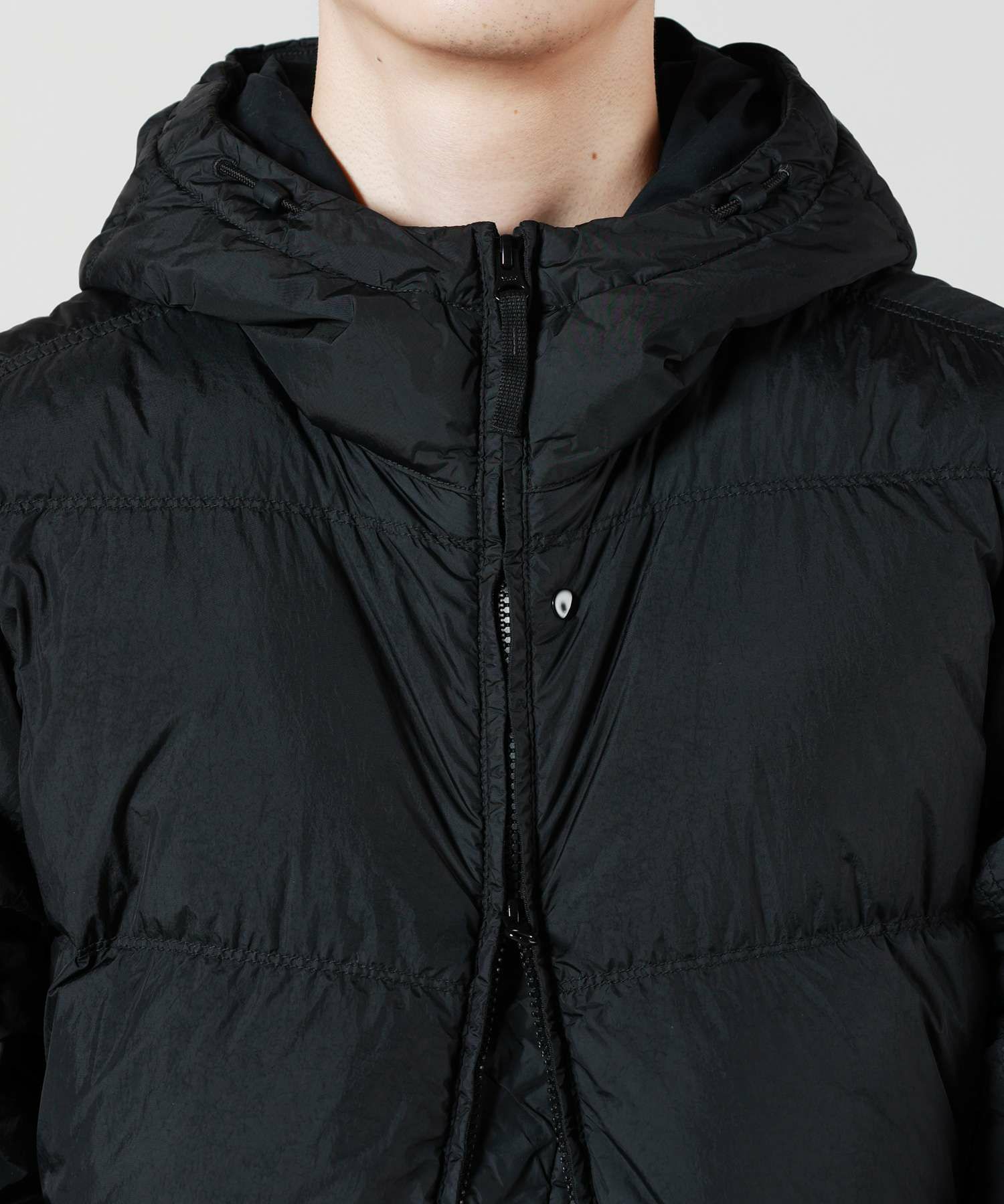 【素材】超高密度で織り上げた軽量なリサイクルナイロンファブリックを使用。内側に樹脂コーティングを施し、防風性と適度な防水性を与えています。樹脂加工を施すことで染料が素材に不均等に浸透し、表面に独特のシワ感が生まれるデザイン。ガーメントダイの工程に耐えられるよう、特殊な加工を施した最高品質の羽毛を充填しています。RDS(Responsible Down Standard)認証取得の羽毛を使用。