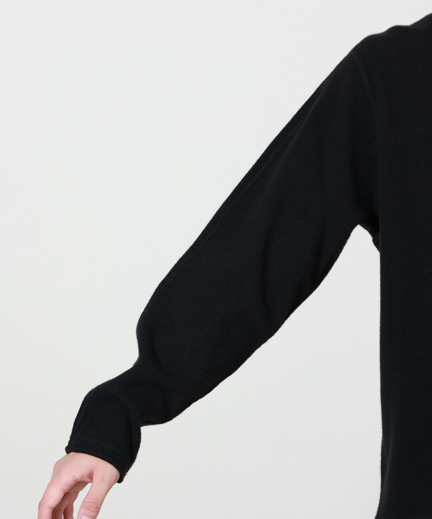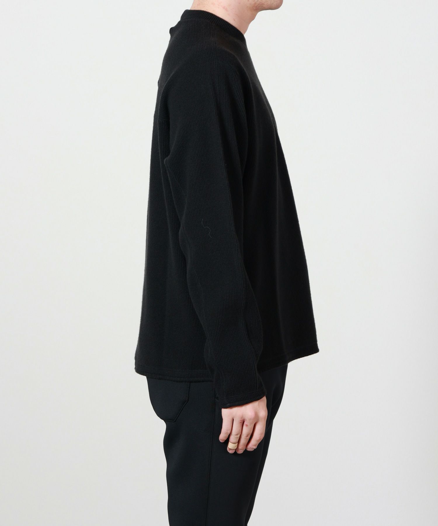 【素材】 ナイロン50%、毛50%の混紡素材を使用し、軽やかな着心地と適度な保温性を実現。チクチク感を抑えた柔らかな肌触りで、秋冬のデイリーウェアとして快適に着用いただけます。程よくフィットするシルエットは一枚着としてはもちろん、アウターのインナーとしても万能に活躍します。