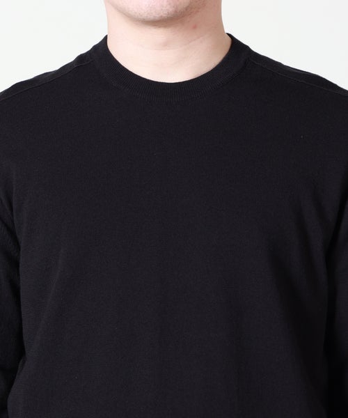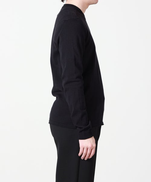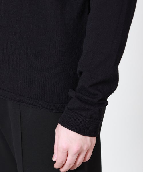 【素材】 軽やかで自然な風合いが特徴のオーガニックコットンを使用。やわらかなタッチとドライでクリーンな質感を併せ持ち、素肌にも心地よい着用感を実現しています。12ゲージの程よい編み立てにより、薄すぎず厚すぎない絶妙なバランスを確保。ロングシーズン着用できる快適さと、上質さを感じさせる編地の表情が魅力です。