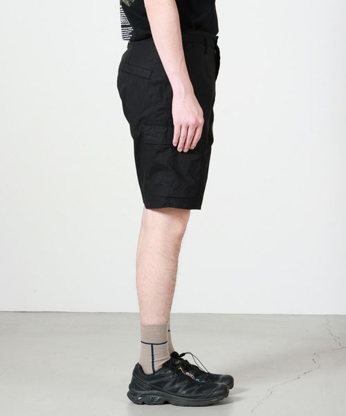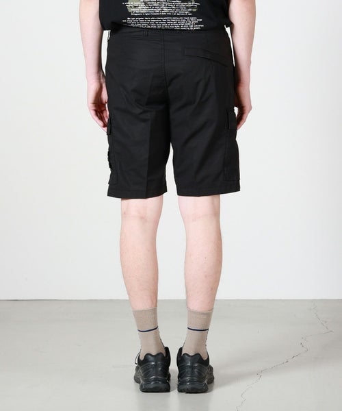 【デザイン】 STONE ISLAND(ストーンアイランド)のショートパンツ。ミリタリーウェア由来の機能美を落とし込みながら、モダンなルックスに昇華したカーゴショートパンツ。レギュラーフィットのシルエットに、フロントのハンドポケットや大きめのカーゴポケットを配置し、日常のアクティブシーンでも実用性を発揮します。ガーメントダイによる深みのあるカラー表現が、シンプルながらも独特の存在感を演出。左サイドにはブランドアイコンのコンパスワッペンがさりげなく配され、控えめなアクセントになっています。