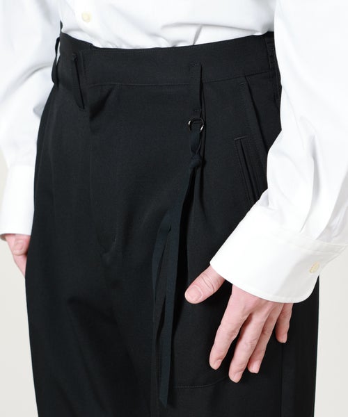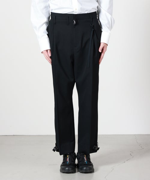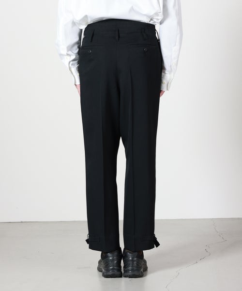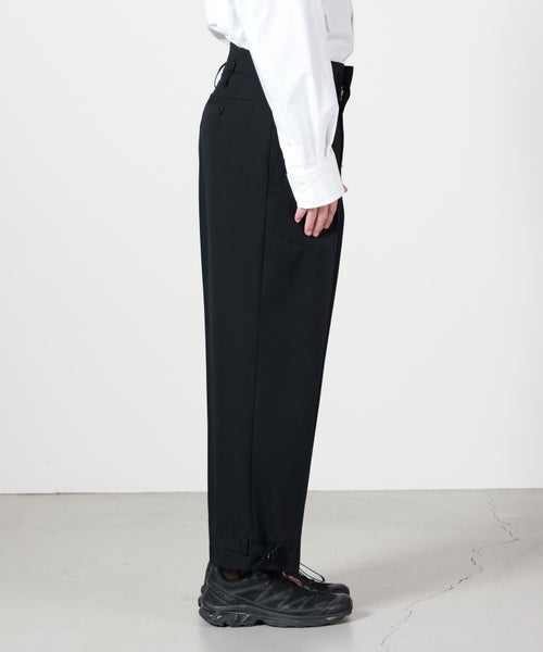 【デザイン】Tamme(タム)のパンツ。U.S.NAVYのA-2デッキジャケットと共に用いられるアメリカ海軍艦上用コールドウェザーパンツであるA-2 デッキパンツがデザインソースのパンツです。本来かなり丈夫でカジュアルな素材ですが、それをウールポリエステルの綺麗目な素材で上品な印象に仕上げています。裾のアジャスター、二重に取り付けられたスラッシュポケット、2タックのデザインが特徴。コーディネートの主役になり、シンプルなトップスと合わせても一気にモードな印象に引き上げてくれる、そんな一本になっております。