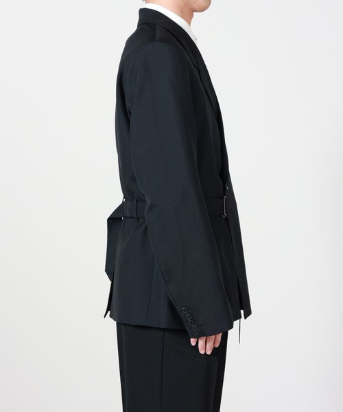 【デザイン】 Tamme(タム)のジャケット。ダブルブレストジャケットです。若干入った肩のパッド・コンパクトな着丈によってトレンド感の高いシルエットが叶います。ジャケットの前立て部分にベルトが付いており、腰回りを絞って、シルエット調整も可能です。存在感のあるシルエットで、Tammeらしい洗練されたモード感のあるシルエットが光る1着。