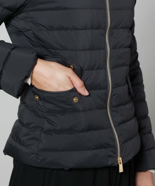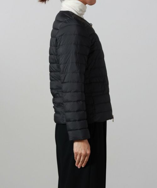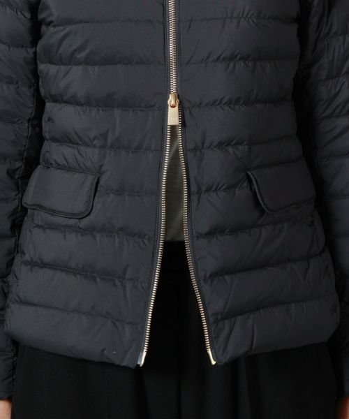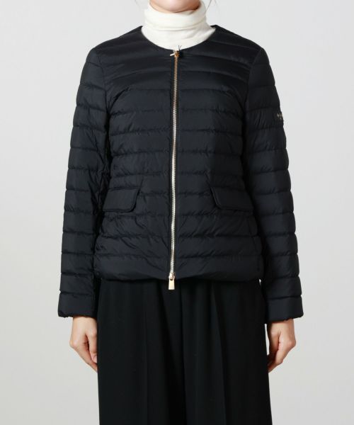 【デザイン】TATRAS(タトラス)のダウン。コンパクトなノーカラーデザインが特徴で、ウエストや袖のラインにこだわり、美しいシルエットを実現。デコルテをさりげなく見せるネックラインや、フロントのゴールドファスナー、腰のスナップボタンが華やかさとアクセントをプラス。ポケット内側には起毛素材をあしらい、手元を暖かく保つ仕様です。カジュアルながら上品な印象で、幅広いコーディネートに馴染む洗練された一着です。