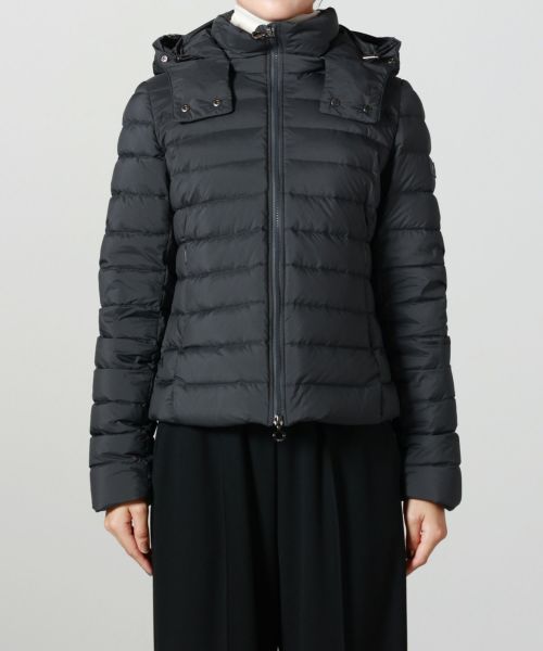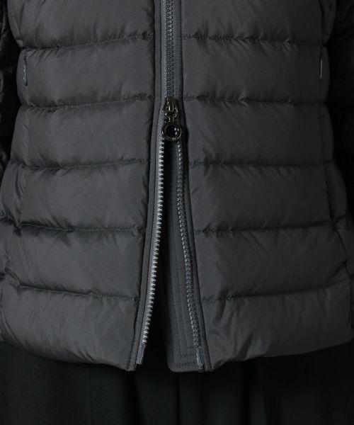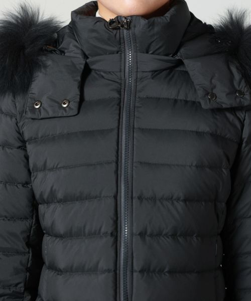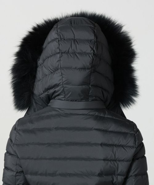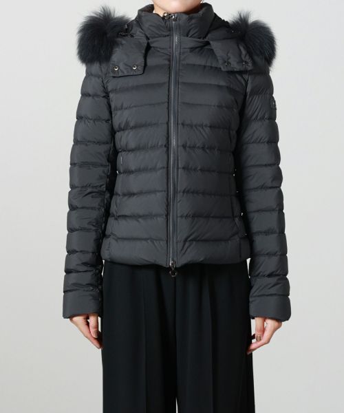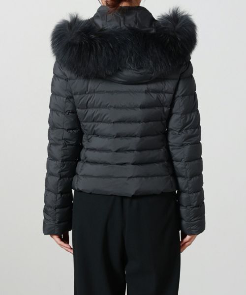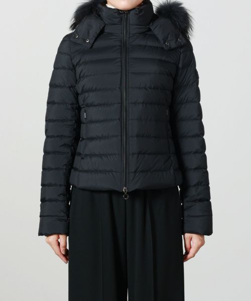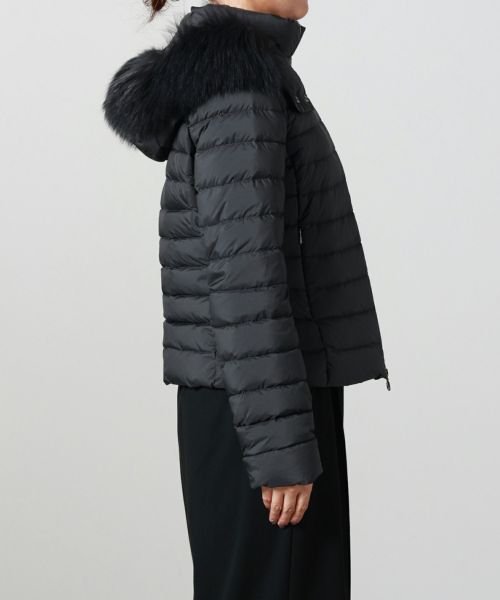 【デザイン】TATRAS(タトラス)のダウン。ダウンステッチの幅を狭くして、ボリュームを抑えたショート丈ダウンジャケットです。 華やかなファーがシーズンムードを演出します。 顔周りまで包み込む、あたたかなフードデザインも印象的。 ややウエストを絞り、メリハリのあるきれいなシルエットに仕上げられました。 腰には小物等の落下を防ぐファスナーポケットを採用。 スライダーにリングが配されており開閉もしやすい仕様に。