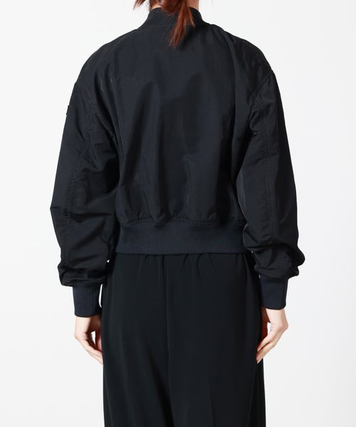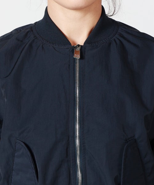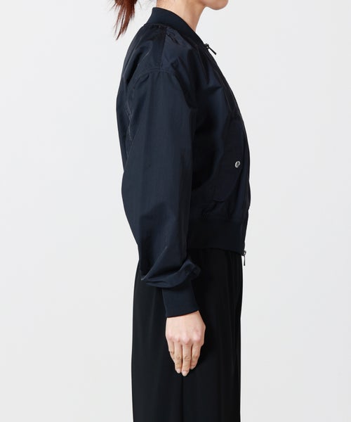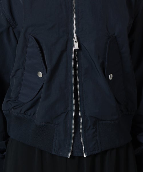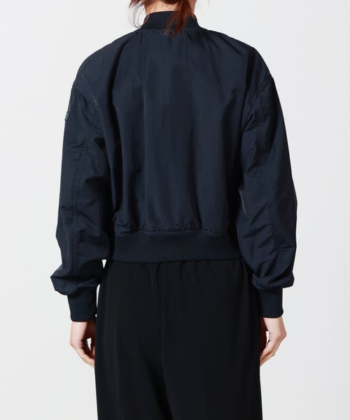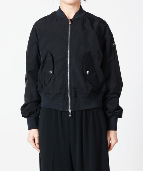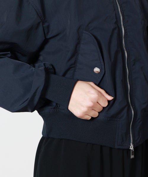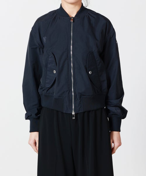 【デザイン】 TATRAS(タトラス)のブルゾン。陰影感のある高密度ナイロンクロスを使用した、モダンな表情のMA-1ブルゾン。光の当たり方によってさりげなく変化する表面感が、シンプルな中に奥行きを生み出します。 オーバーシルエットに広めの袖幅、ドロップショルダーを組み合わせ、抜け感のあるバランスに設計。ゆとりを持たせながらもショート丈にすることで、全体をすっきりとまとめています。 袖口と裾はリブで切り替え、丸みのあるフォルムとメリハリをプラス。さらに、艶のあるメタル調ファスナーやドットボタンがアクセントとなり、上品さと存在感を高めています。 カジュアルからきれいめまで幅広いスタイリングに対応する、完成度の高い一着です。