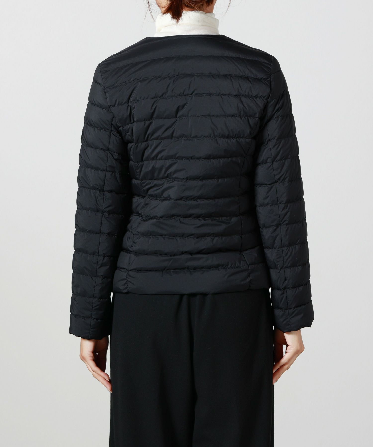 【デザイン】TATRAS(タトラス)のダウン。コンパクトなノーカラーデザインが特徴で、ウエストや袖のラインにこだわり、美しいシルエットを実現。デコルテをさりげなく見せるネックラインや、フロントのゴールドファスナー、腰のスナップボタンが華やかさとアクセントをプラス。ポケット内側には起毛素材をあしらい、手元を暖かく保つ仕様です。カジュアルながら上品な印象で、幅広いコーディネートに馴染む洗練された一着です。