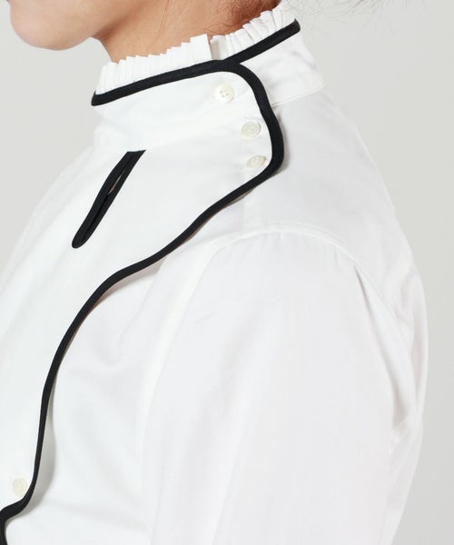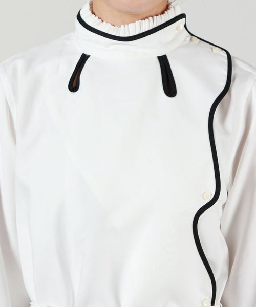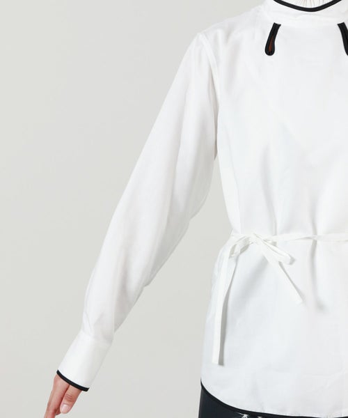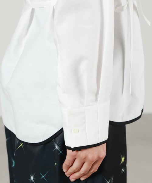 【デザイン】 TELMA(テルマ)のシャツ。 柔らかなホワイトをベースに、ゆるやかな曲線やアシンメトリックなカッティングがアクセントになった、モダンでミニマルな一枚。立体的なパネル使いが生み出す曲線的なラインは、シンプルながらも動きに合わせて自然に表情を変え、身体を美しく包み込みます。ドロップショルダーと若干ゆとりをもたせた身幅により、リラックス感と上品な抜け感を両立。ヒップにかかる程よい着丈で、フロントインでもアウトでもさらりと決まる1着です。