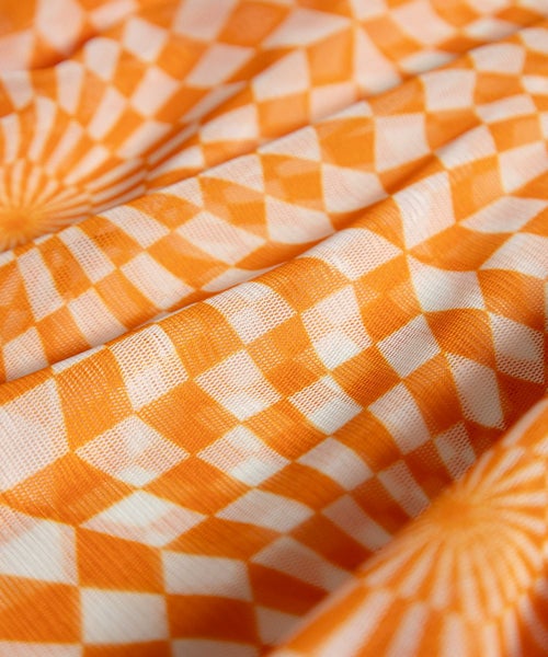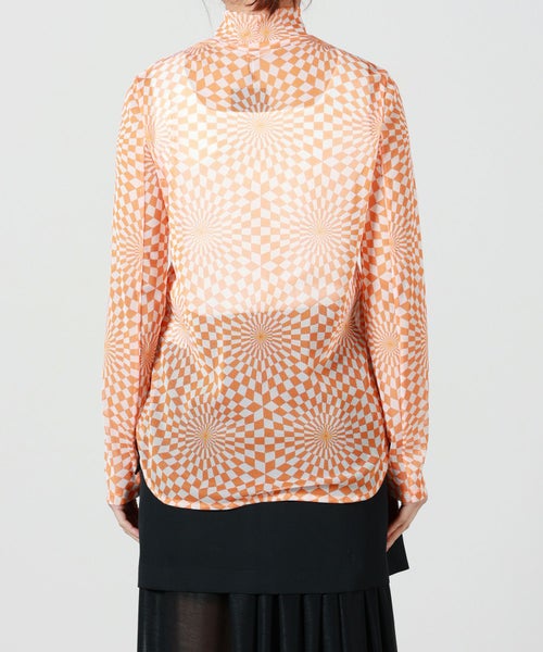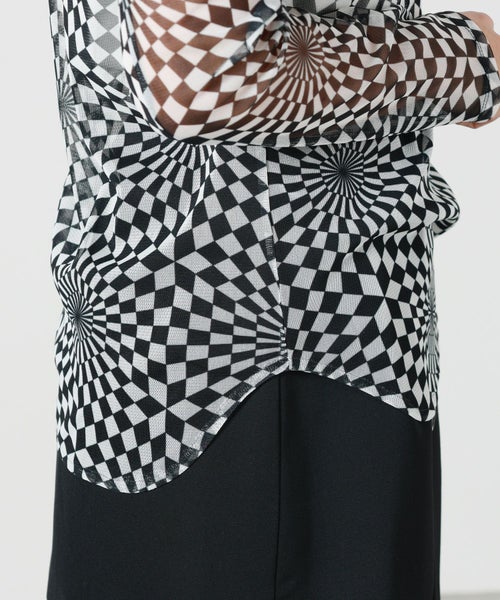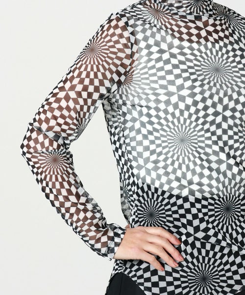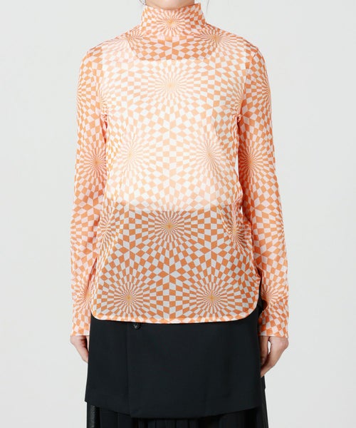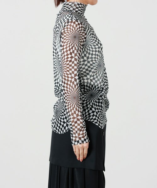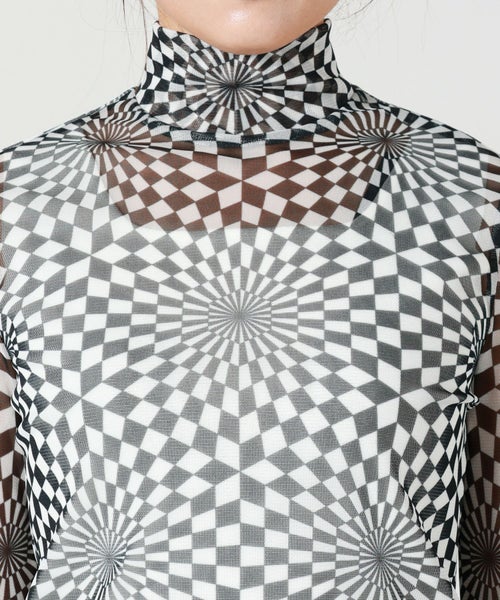 【デザイン】TELMA(テルマ)のハイネックトップス。 チェス盤のような切り替えデザインが印象的な一着で、モード感と品の良さを兼ね備えたシアートップスです。透け感のある素材が軽やかさを引き立て、大人の抜け感を演出します。ハイネックがアクセントとなり、シンプルながらも上品な印象を与えます。カジュアルにもきれいめにもコーディネートできるため、シーンを選ばず活躍します。