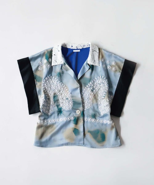 【素材】 麻、レーヨン、ナイロンを混紡した素材で、清涼感と軽やかさを持ちつつ、程よいハリ感を実現。刺繍部分には、キュプラとレーヨンを使用し、繊細さと厚みを両立させています。身頃と襟部分には、ポリエステルを使用しており、軽さと耐久性を兼ね備えています。軽やかな着心地を保ちながらも、アートのような表情を持つ一枚です。