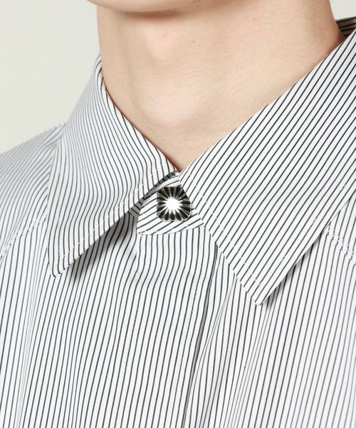 【デザイン】 TOGA TOO(トーガ トゥー)のストライプシャツ。TOGAらしい存在感あるオーセンティックなデザインで、第一ボタンにはコンチョボタンを採用。大きめで主張するボタンがアクセントとなり、シンプルなシャツに個性を添えています。クラシックなストライプはカジュアルながら上品さもあり、レイヤードスタイルにも幅広く対応。ややゆったりめのシルエットと計算されたレングスが、スタイリングにバランスの良い抜け感を演出します。シンプルな装いにさっと羽織るだけで、一気に洗練された印象に仕上がる一着です。