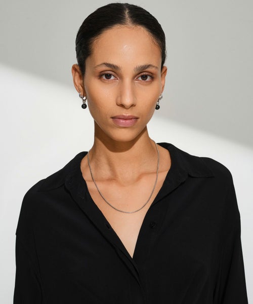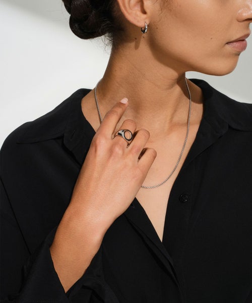 【素材】 リサイクルされた925スターリングシルバーを使用し、滑らかで心地よい手触りを提供します。表面にはホワイトロジウムプレーティングを施すことで、強化されて変色を防ぎ、美しい輝きを長く保ちます。見る角度によって異なる光沢を楽しめ、どんなスタイルにも調和するのが特徴です。