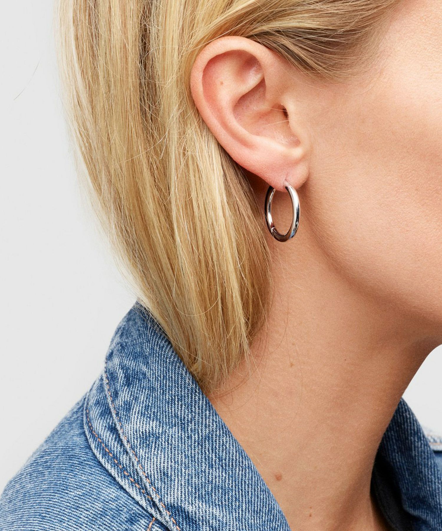 【デザイン】 クラシックフープスモールは、ミニマルなデザインながらも確かな存在感を放ちます。フープは高品質の925スターリングシルバーでできており、表面を強化して汚れを防ぐために白いロジウムでメッキされています。 シンプルなデザインなので、他のイヤリングやイヤーカフとの組み合わせもおすすめ。
