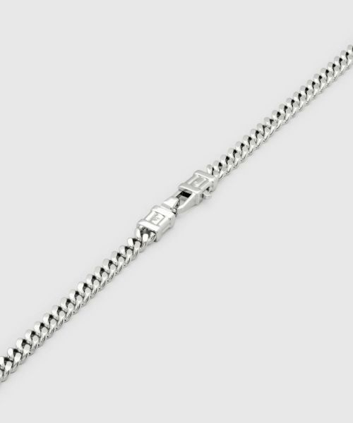 このチェーンはポリッシュ仕上げのリサイクル・スターリングシルバー925製で、表面を強化し変色を防ぐためにホワイトロジウムプレーティングが施されています。