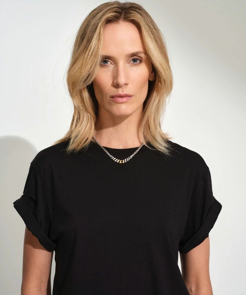 【デザイン】TOMWOOD(トムウッド)のネックレス。大ぶりなカーブ・チェーンが独特な存在感を放ち、10個のリンクが連なることで、オリジナルなデザインに豊かな表情を加えています。中央の2つのリンクに施された18Kゴールドコーティングが、シンプルながらも華やかさを引き立てます。トムウッドのカスタムメイドのロックシステムが、安定感と使いやすさを提供しています。