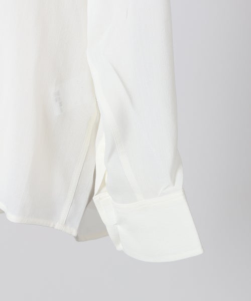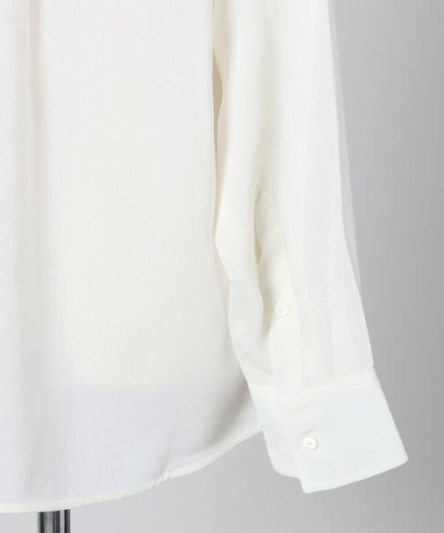 【素材】 レーヨンをベースにウールをブレンドしたクレープ素材を使用。手に取るとさらりとしたドライなタッチで、軽やかさの中にほんのりとしたしなやかさを感じられます。着用時には自然なドレープが生まれ、動くたびに柔らかく揺れる上品な印象に。透け感があるため、インナー選びによって印象が左右される点はありますが、同系色のインナーを合わせることで洗練された統一感のある着こなしに仕上がります。見た目にも軽やかで、シーズンムードを高めてくれる素材感です。