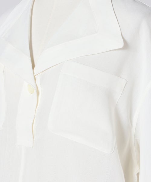 【デザイン】TOTEME(トーテム)のシャツ。襟が重なり合うように設計された独自のネックデザインが印象的で、シンプルながらも構築的な美しさを感じさせる一着です。フロントにはフラップ付きの胸ポケットを2つ配し、ミリタリーライクな要素をさりげなくプラス。さらにネックラインに留めるボタンディテールがアクセントとなり、開け方次第で表情の変化を楽しめます。全体はゆとりのあるシルエットで、身体のラインを拾いにくく、抜け感のある洗練されたスタイリングを演出。1枚ではもちろん、インナーとのレイヤードで透け感を活かした着こなしもおすすめです。
