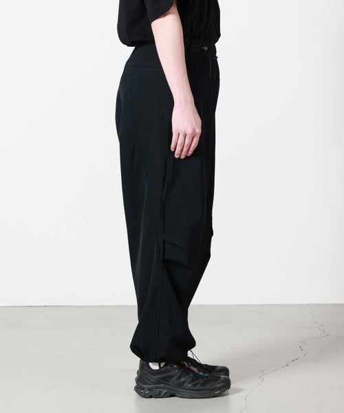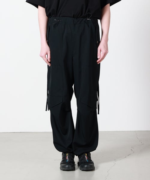 【デザイン】 UJOH(ウジョー)のパンツ。フロントに配した大ぶりの逢うとポケットが存在感あるユーティリティパンツです。バックスタイルはシャープな切替ラインで構築的な印象に。ウエストと裾はドローコードで調節できる仕様。ゆとりあるシルエットながら洗練された印象で、須地リングにエッジを加える一本です。