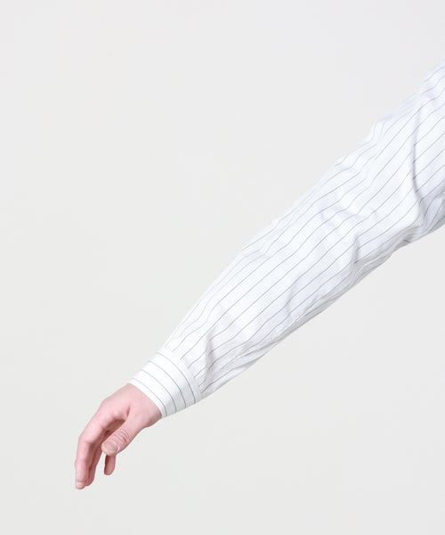 【素材】 高密度の100/2ポプリンストライプ。適度なハリ感と滑らかさ、クリアな表情が特徴の生地です。