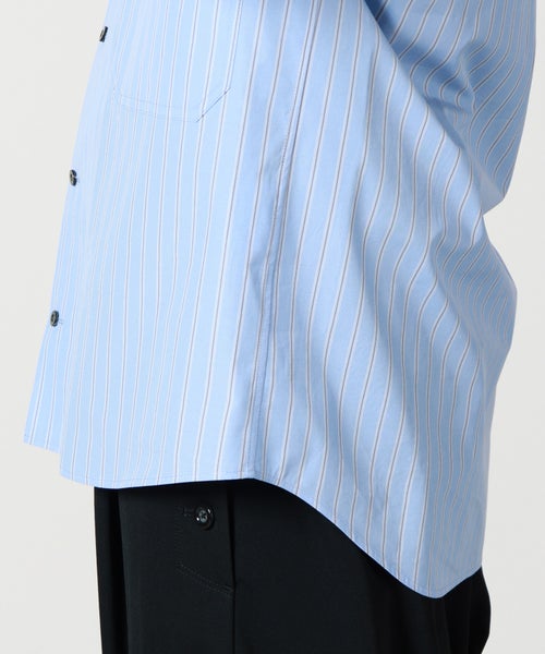 【デザイン】 UJOH(ウジョー)のシャツ。衿の開きを深めに設定することで胸元に抜け感を与え、細身のシルエットがシャープでモダンな印象。胸元のフラップポケットがアクセントとなり、シンプルながらも存在感のあるデザインに。上品さと軽快さを兼ね備え、幅広いスタイリングに活躍します。