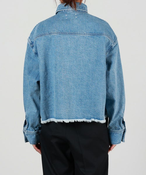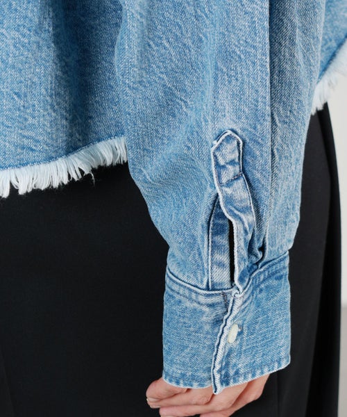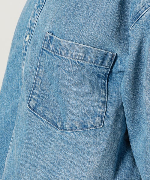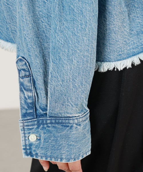 【デザイン】upper hights(アッパーハイツ)のデニムシャツ「THE CROPPED ESSENCE(ザ クロップト エッセンス)」は、オーバーサイズのクロップド丈デザインが特徴です。フリンジ仕上げの裾が、シンプルなデニムシャツに動きを加え、コーディネートの主役になるアイテムです。しっかりとした厚手の生地を使用しており、Gジャンにも採用される素材感が軽いアウターとしても活躍します。美しいインディゴブルーは、茶綿を使わないことで、くすみのない鮮やかな色合いが特徴です。